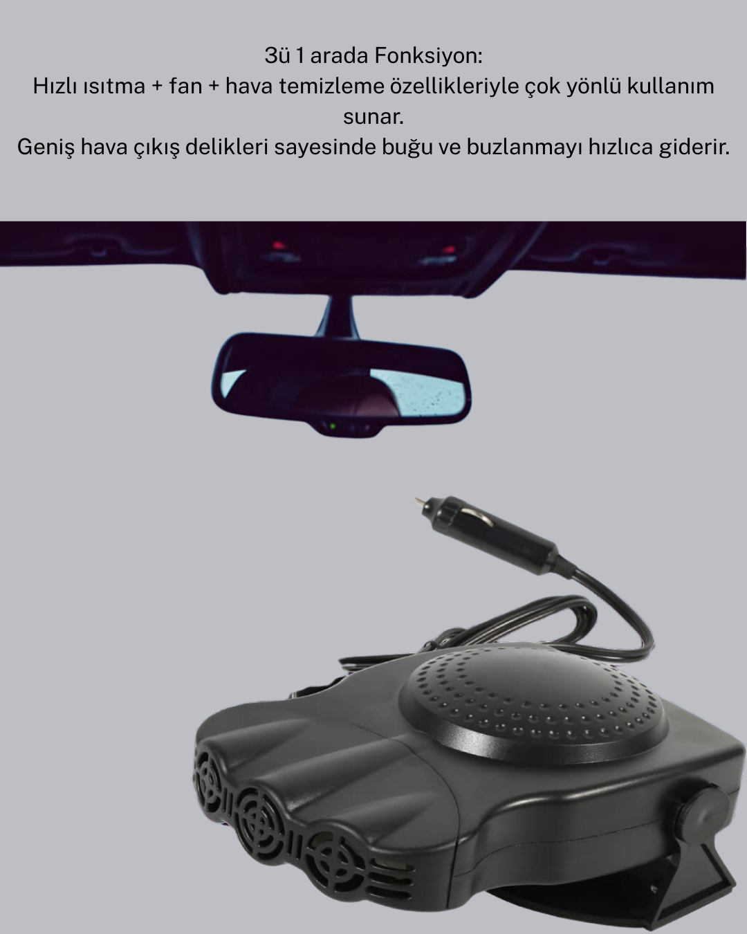 Ürün Özellikleri:150W güç çıkışıABS dayanıklı malzemeBoyut: 17,2 x 12,2 x 6,5 cm1,2 m uzun kablo12V araç uyumluluğuKullanım Avantajları:30 saniyede sıcak hava üflemeAracın camındaki buzlanmayı hızlı çözerYazın serinletici fan olarak kullanılırAraç elektroniğini etkilemezKompakt tasarımı ile yer kaplamazKullanım Talimatı:Ürünü araç çakmak girişine takın.Panel üzerine sabitleyin.Döner başlığı ayarlayın.Kullanım modunu seçip çalıştırın.