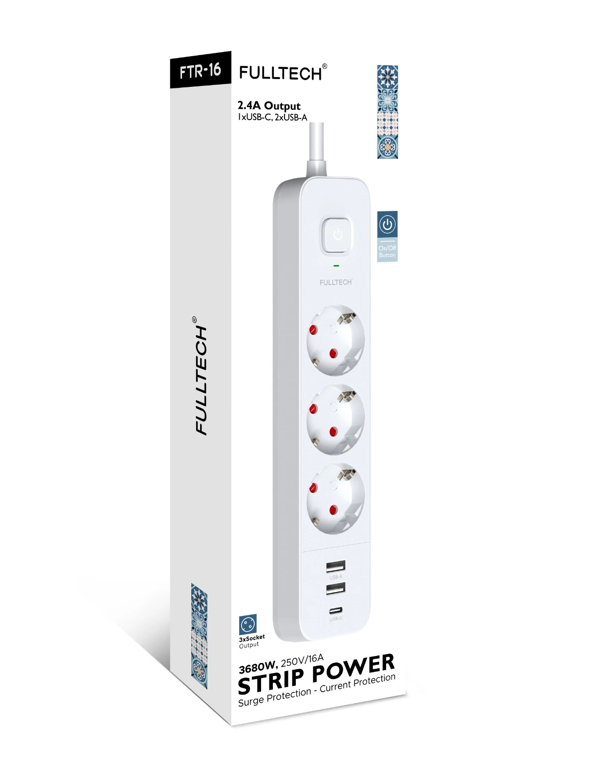 Akım Korumalı 3'lü Priz 2xUsb 1xType-C 3680W Girişli Uzatma Kablolu Priz Ftr16