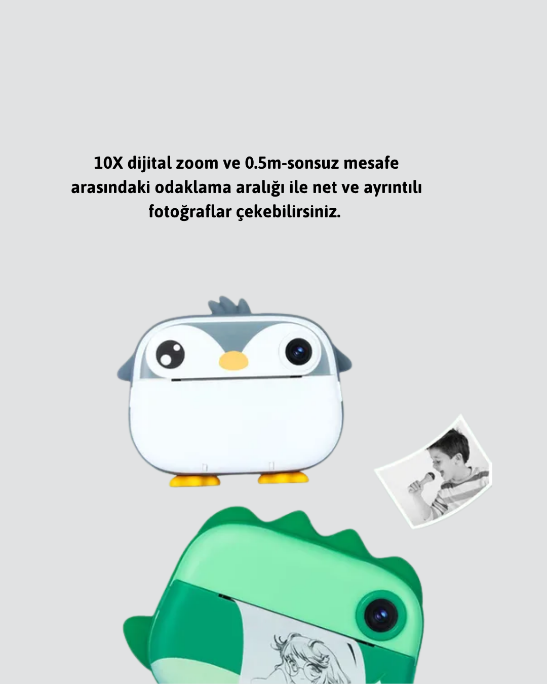 baskı kamera, dijital fotoğraf çekim deneyimini anında baskı özelliği ile birleştiriyor. Çift lens sistemi sayesinde çekilen fotoğraflar hem net hem de canlı renklere sahip olur. 10X dijital zoom ile en küçük detayları bile kolayca yakalayabilirsiniz. 0.5 metreden sonsuz mesafeye kadar odaklama yapabilen kamera, her tür çekim için uygundur.Fotoğraf kalitesini artıran ISO ayarları (otomatik, 50, 100, 200, 400, 800, 1600) sayesinde, farklı ışık koşullarında dahi mükemmel sonuçlar elde edebilirsiniz. 12 farklı özel efekt, çekimlerinize yaratıcılık katmanıza olanak sağlar. Self-timer seçenekleri ile grup fotoğraflarınızda veya kişisel çekimlerde kolaylıkla zaman ayarlaması yapabilirsiniz.Kamera, 3 adet baskı rulosu ile birlikte gelir ve her rulo 500 fotoğraf basma kapasitesi sunar. Uzun süre baskı yapabilme imkanı ile kullanıcıların ihtiyaçlarına cevap verir. Ayrıca, 64GB’a kadar TF kart desteği sayesinde depolama alanınızı artırabilirsiniz.1080P ve 720P video çekim özelliği ve dahili mikrofonu ile sadece fotoğraf değil, aynı zamanda yüksek kaliteli video kayıtları da yapabilirsiniz. MP3 müzik çalar fonksiyonu ise cihazı çok yönlü bir multimedya aracına dönüştürür.Çoklu dil desteği sayesinde farklı dillerde kolay kullanım imkanı sağlar. Ergonomik ve kullanıcı dostu tasarımı ile her yaştan kullanıcıya hitap eden GCH62 baskı kamera, anılarınızı en kaliteli şekilde yakalamanıza ve anında fiziksel baskısını almanıza olanak tanır.