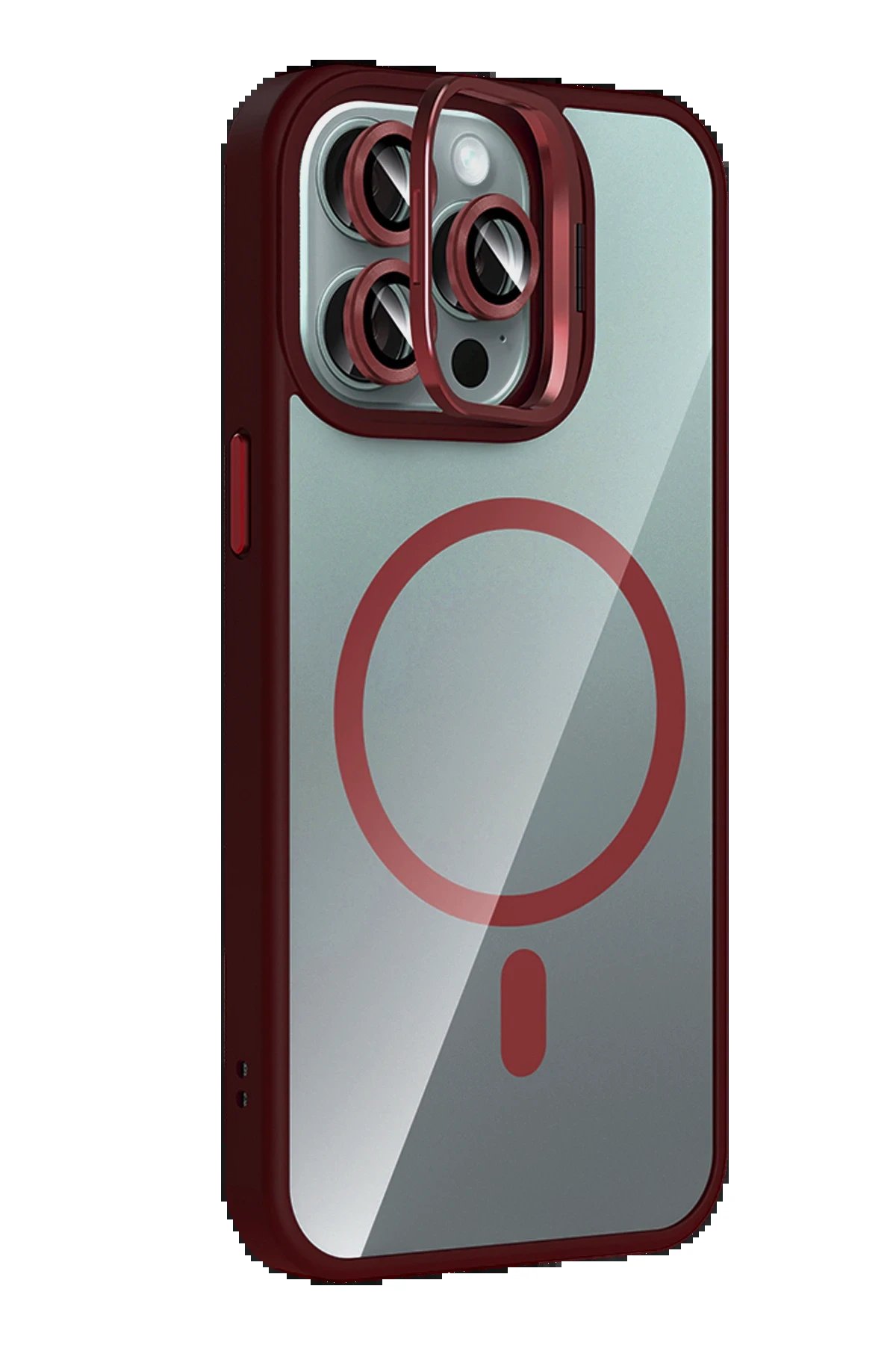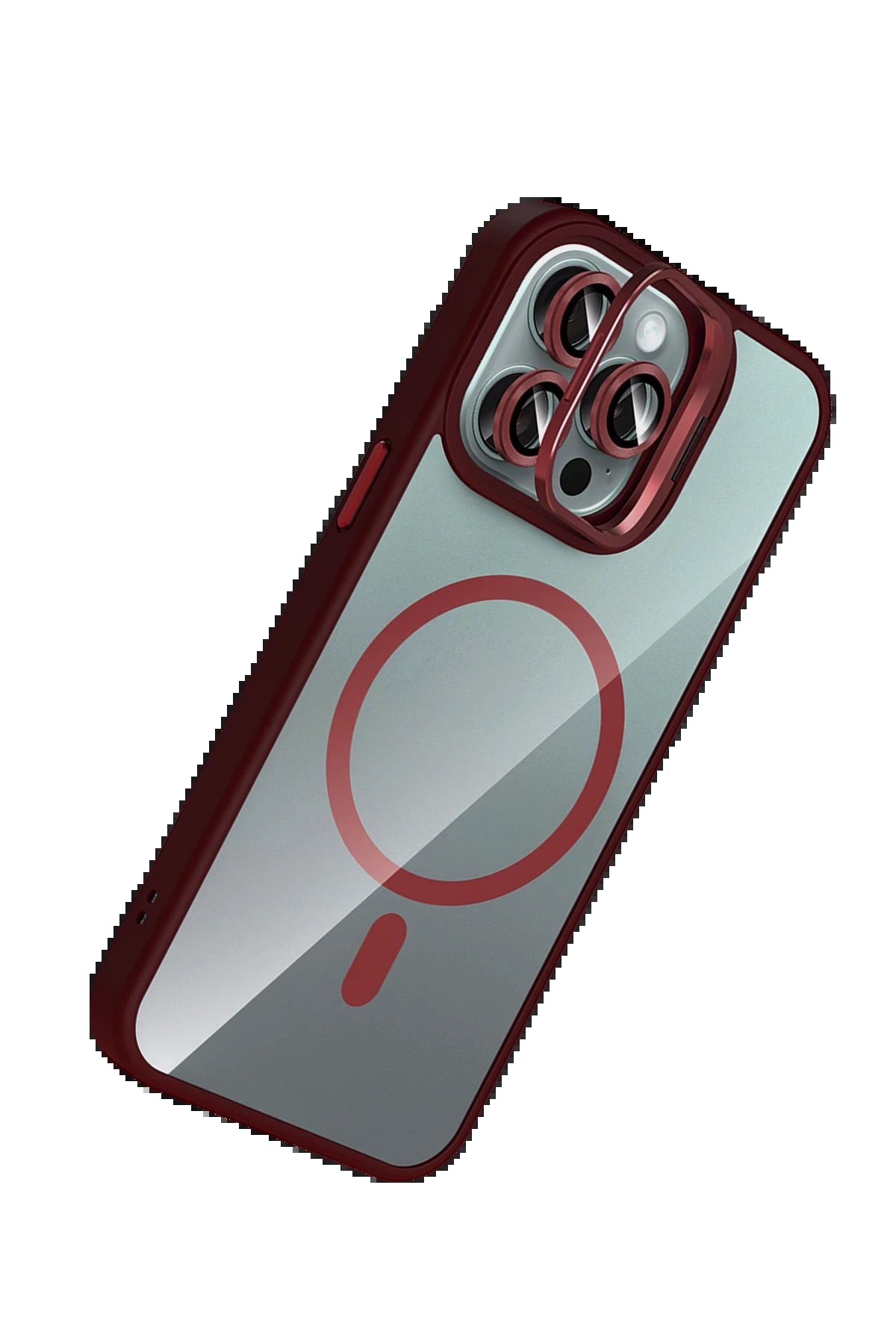 Apple iPhone 15 Pro Max Remim Lensli Magsafe Standlı Kapak - Bordo-(5796)