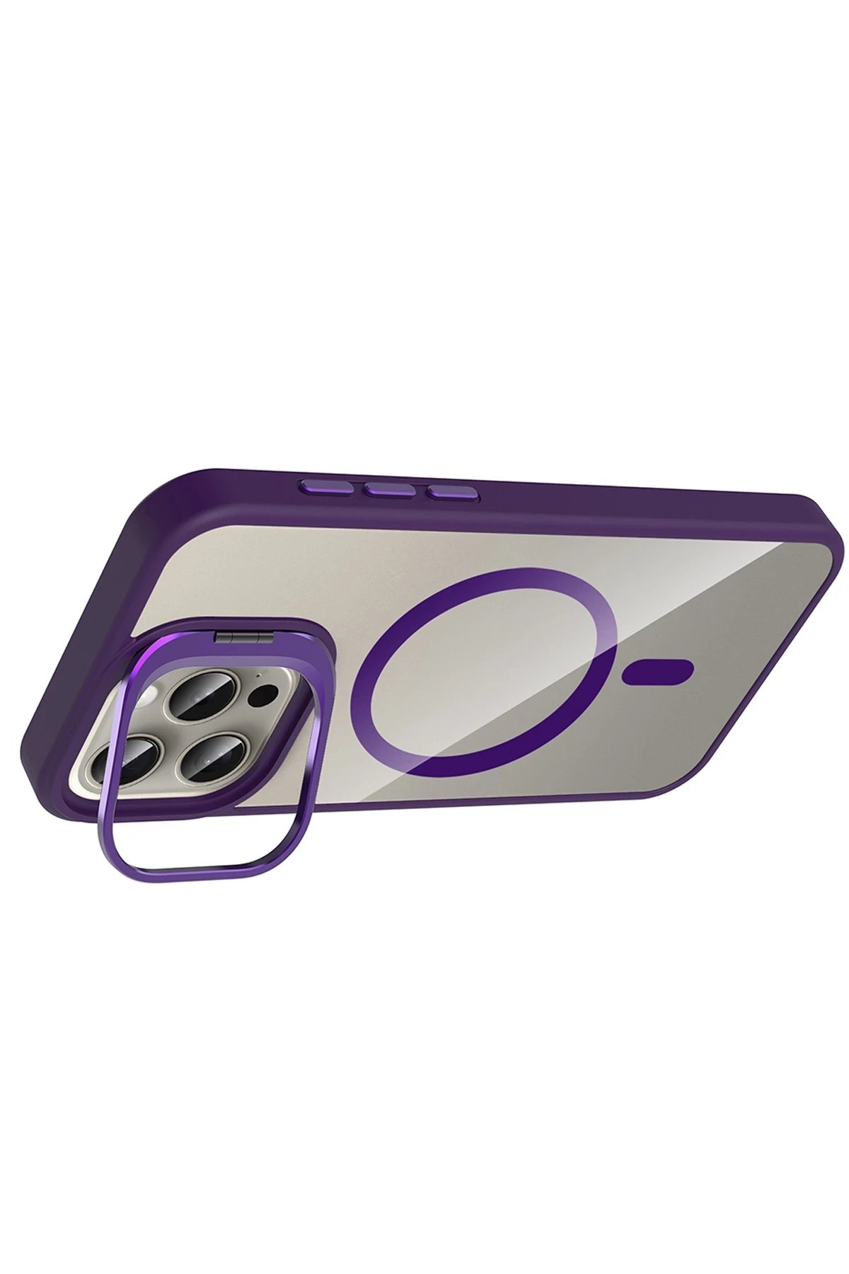 Apple iPhone 15 Pro Max Remim Lensli Magsafe Standlı Kapak - Derin Mor-(5796)