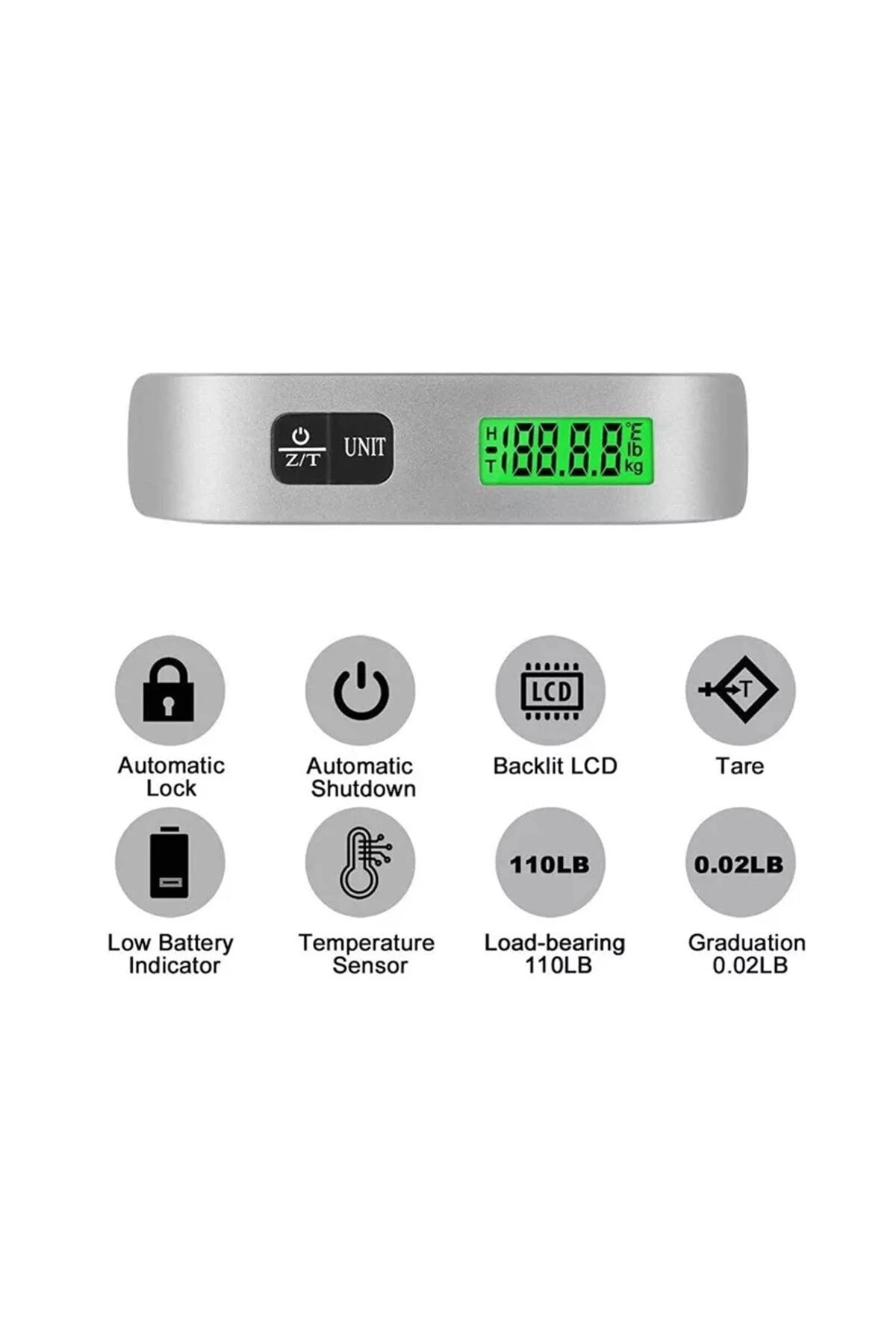 Dijital el kantarı 50 kg bavul kurban terazisi 10 gram hassasiyet On-Off tuşu sayesinde kolayca açma-Kapama Otomatik sıfırlama fonksiyonu Dara alma fonksiyonu Işıklı ekranı sayesinden karanlık ortamlarda ölçüm yapmayı kolaylaştırır. Seyahatinize çıkmadan önce bavullarınızı tartarak hava alanlarında ağırlık problemi yaşamazsınız. Kapasite: 50 kg Ölçüm hassasiyeti: 10 g Kanca uzunluğu: 20 cm