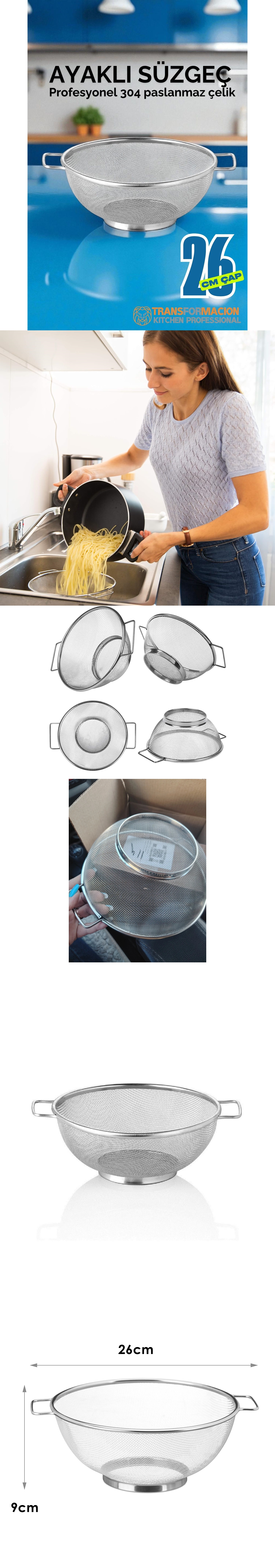 Bu paslanmaz çelik süzgeç, ince delikli yapısı sayesinde yiyeceklerinizi hızlı ve etkili bir şekilde süzmenize yardımcı olur.