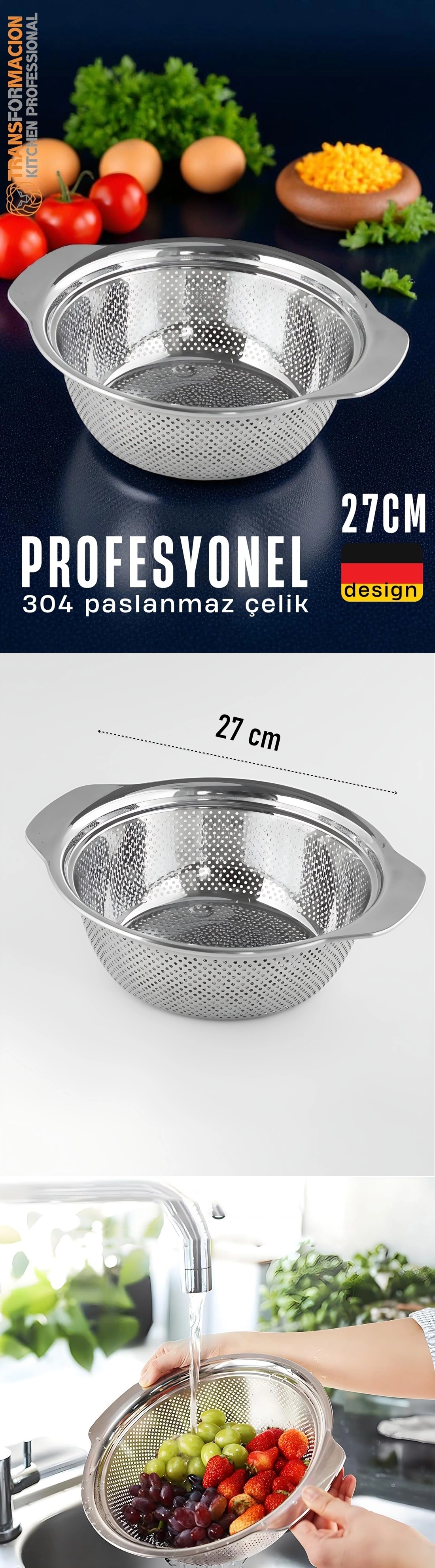 27 CM Genişlik – Çok Amaçlı Kullanım Makarna, sebze, meyve veya bakliyat süzmek için ideal boyut.