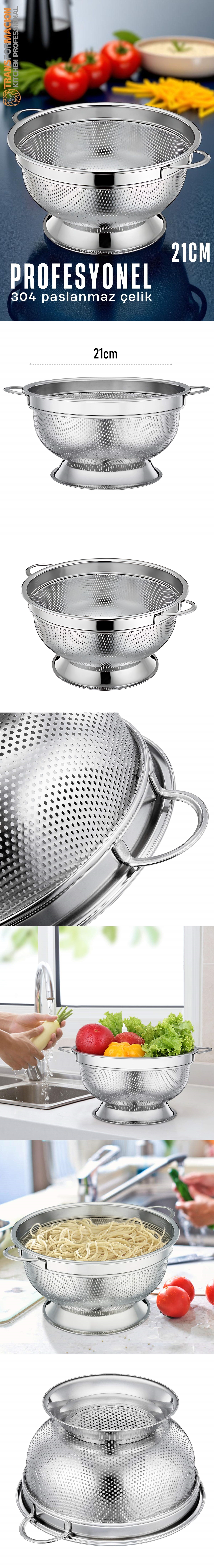 Paslanmaz çelik süzgeç 21 cm, 304 kalite makarna süzgeci olarak profesyonel ve ev tipi kullanımlarda güvenli ve hijyenik bir çözüm sunar. Çift kulplu dayanıklı gıda süzgeci, su tahliyesi konusunda verimli performans sağlarken mutfakta zamandan tasarruf etmenize yardımcı olur."