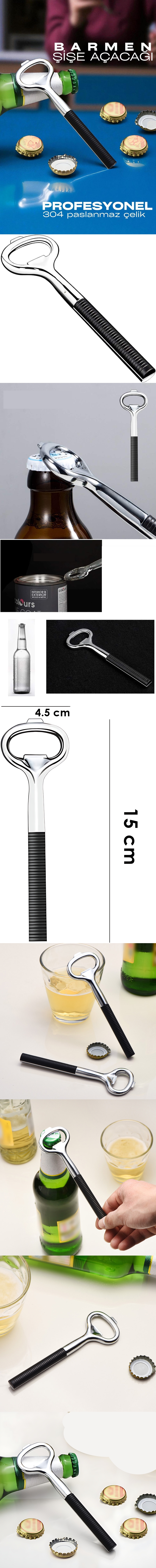 Bar, restoran ve ev kullanımı için özel olarak tasarlanmış bu barmen tipi şişe açacağı, 304 kalite paslanmaz çelikten üretilmiştir ve uzun ömürlüdür.