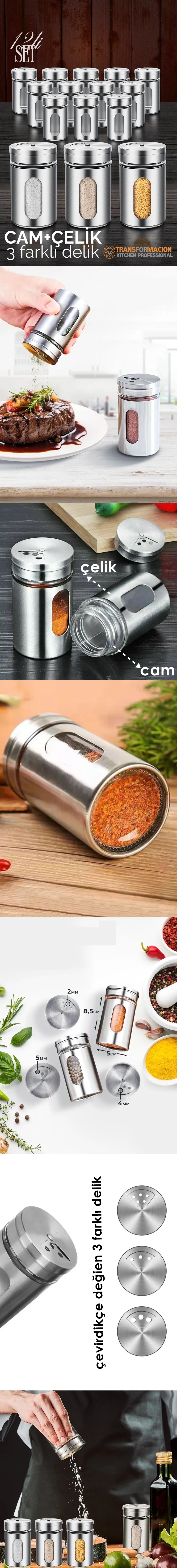 Cam Üzeri Çelik Baharatlık Seti – 12’li Ayarlanabilir Delikli Tasarım