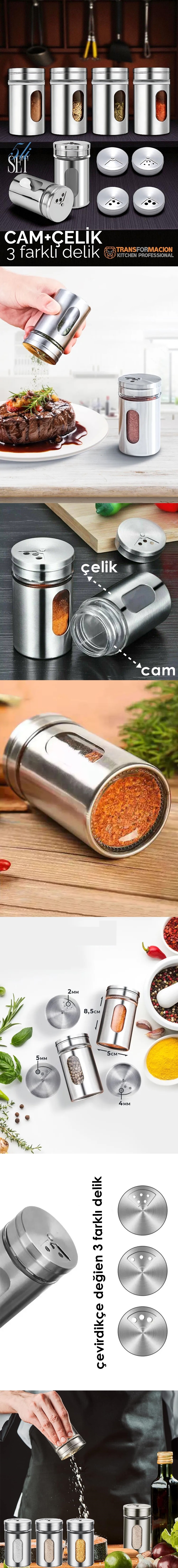 Modern mutfaklar için hem şık hem kullanışlı bir çözüm sunan bu baharatlık seti, cam gövde üzerine paslanmaz çelik giydirme yapısıyla dikkat çeker.