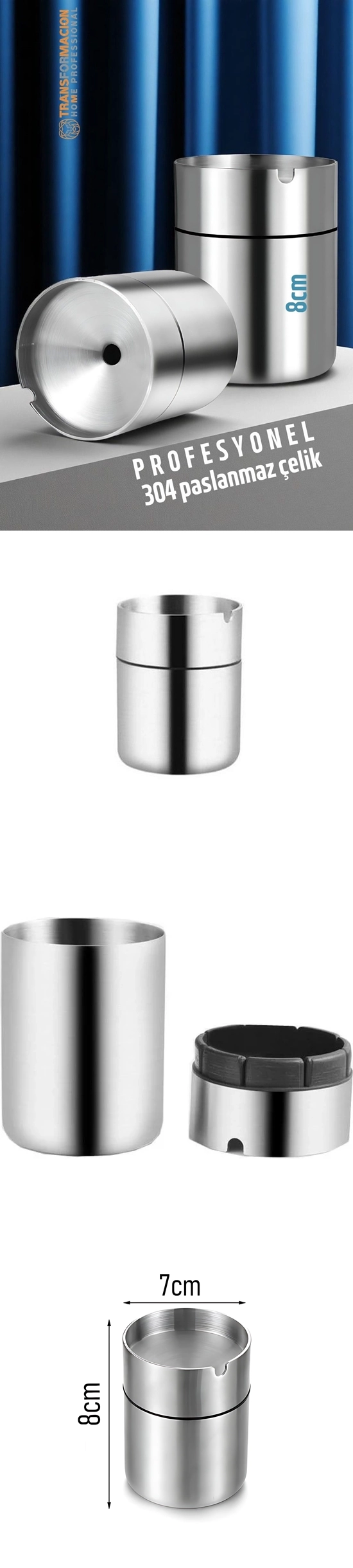 "304 kalite paslanmaz çelikten üretilen bu kapaklı küllük, masaüstü veya balkon kullanımı için tasarlanmış, koku önleyici özelliği ve rüzgar geçirmez yapısıyla şık ve işlevsel bir metal küllüktür."