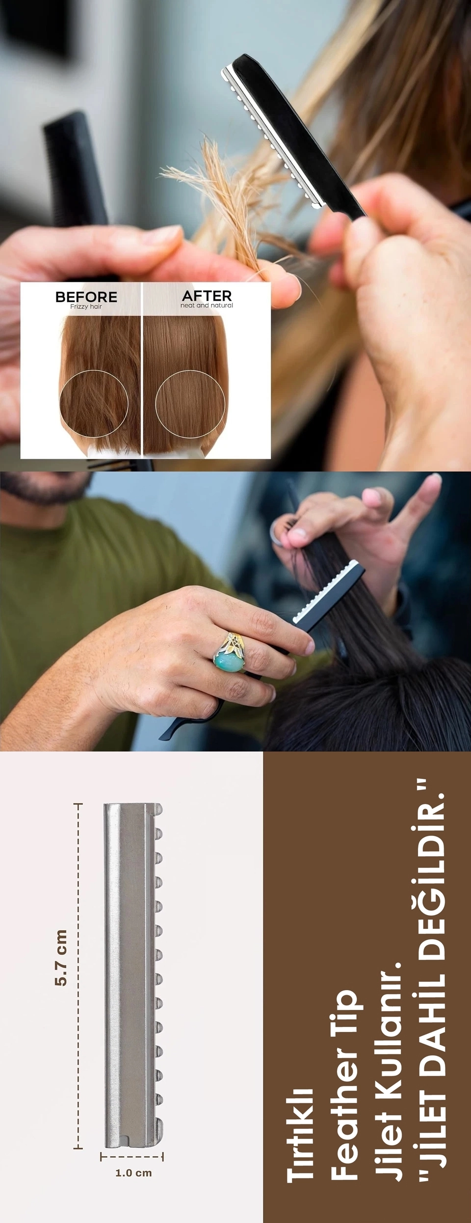 • Uygulama: Tarağın tırtıklı bölgesi jiletle birleşerek saç uçlarını nazikçe keser.