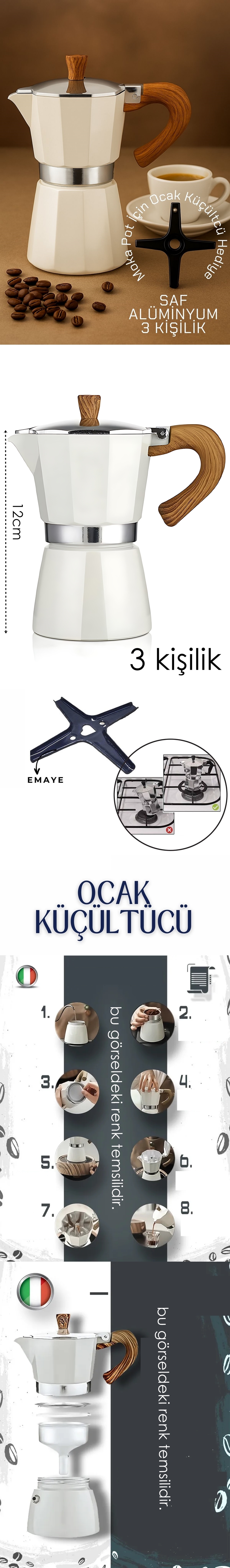HSNET Italyan Moka Pot - 6061 Saf Alüminyum Ahşap Saplı - 3 kişilik KREM