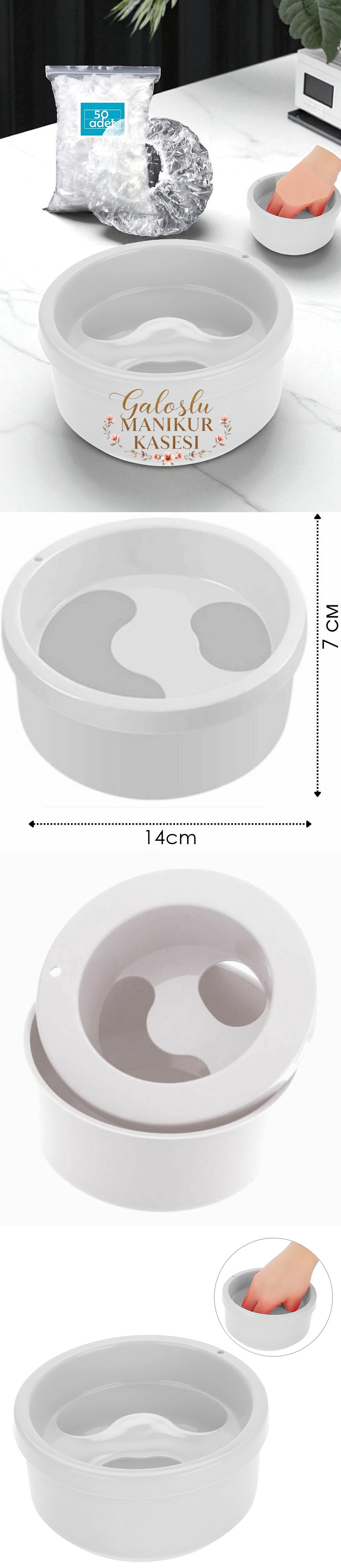 "Parmak yuvalı ergonomik kase ve 50 adet   galoş içeren bu manikür seti, el bakımında hijyen ve konforu bir araya getirerek hem ev hem salon kullanımı için pratik ve profesyonel bir çözümdür."