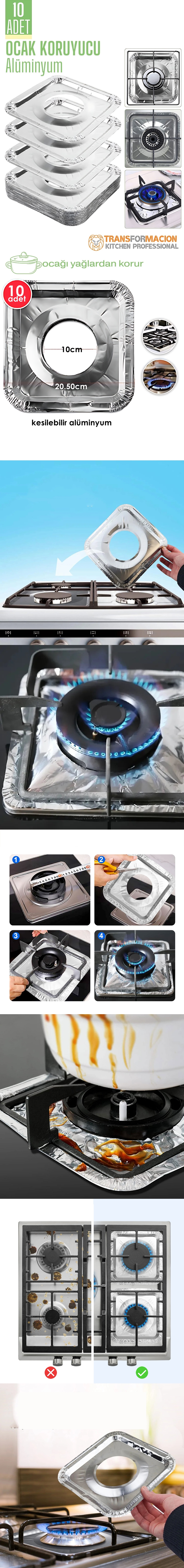 Mutfakta temizlik artık çok daha kolay! Bu 10 parçalı alüminyum ocak koruyucu seti, ocak gözlerinin etrafını yağ, kir ve yiyecek döküntülerinden korur.