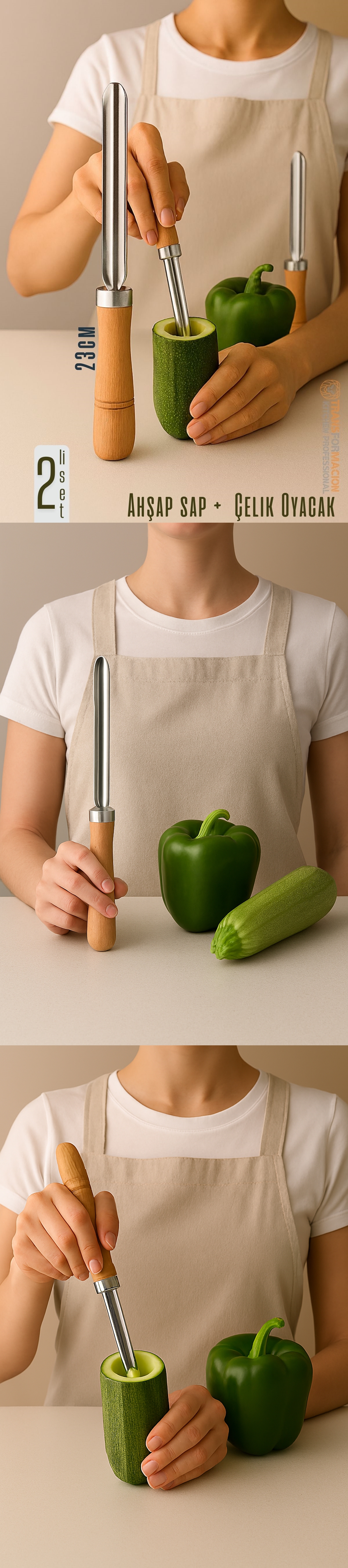 Dolmalık Biber & Kabak Oyacağı – 23 cm | 304 Paslanmaz Çelik + Ahşap Sap | HSNET Kitchen Professional