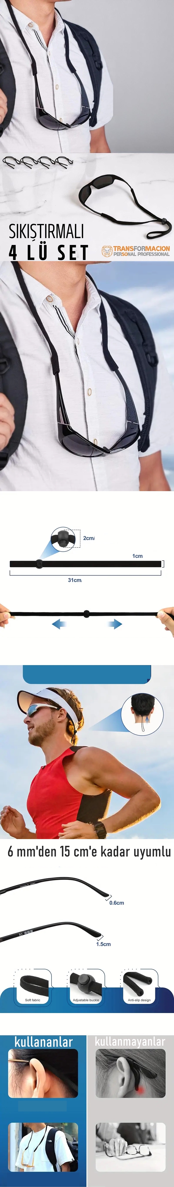 AKTİF İNSANLAR İÇİN :Bu gözlük bandı, gözlük veya güneş gözlüğü sahibi olan herkes için idealdir. Güneş gözlüğü kordonu, güzelliği ve stili işlevsellikle birleştiren siyah renkte mevcuttur.