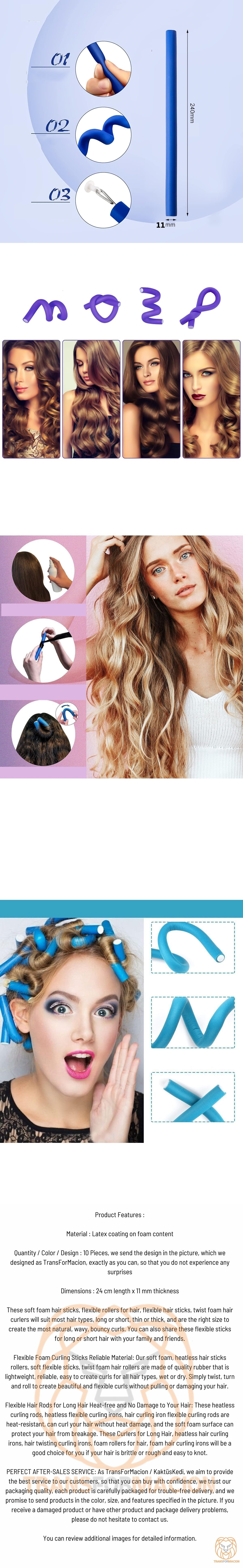 Bu yumuşak köpük saç çubukları, saçlar için esnek rulolar, esnek saç çubukları, bükümlü köpük saç bukle maşaları uzun veya kısa, ince veya kalın çoğu saç tipine uyacak ve en doğal, dalgalı, kabarık bukleleri oluşturmak için doğru boyuttadır. Uzun ya da kısa saçlara yönelik bu esnek çubukları aileniz ve arkadaşlarınızla da paylaşabilirsiniz.