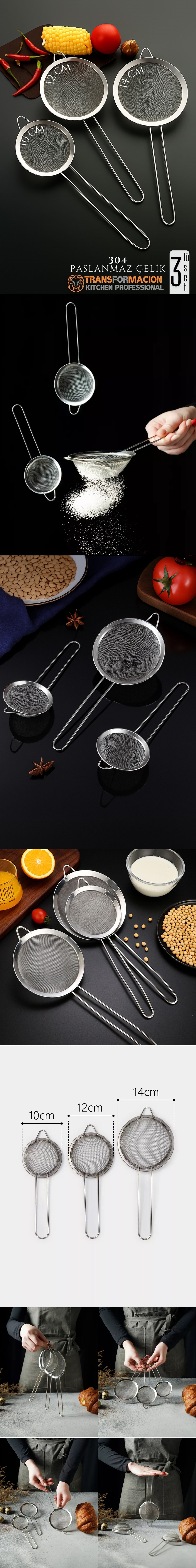 Set İçeriği: 3 adet süzgeç (10 cm, 12 cm, 14 cm)