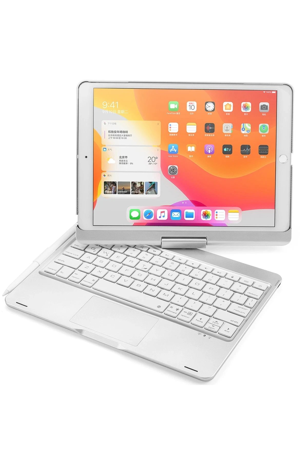 iPad 10.2 (7.nesil) Kılıf Magic Dönen Klavyeli Tablet Kılıf - Gümüş-(5796)