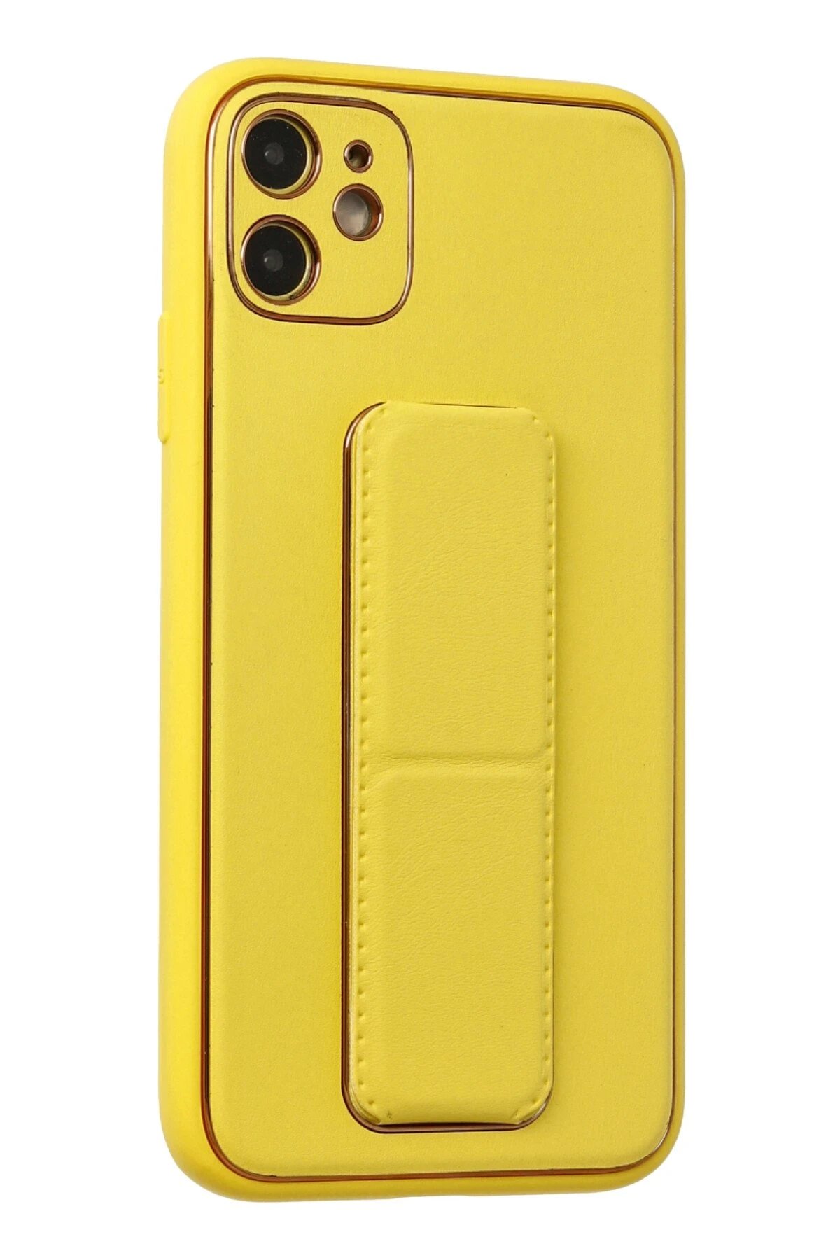 iPhone 12 Kılıf Coco Deri Standlı Kapak - Sarı-(5796)