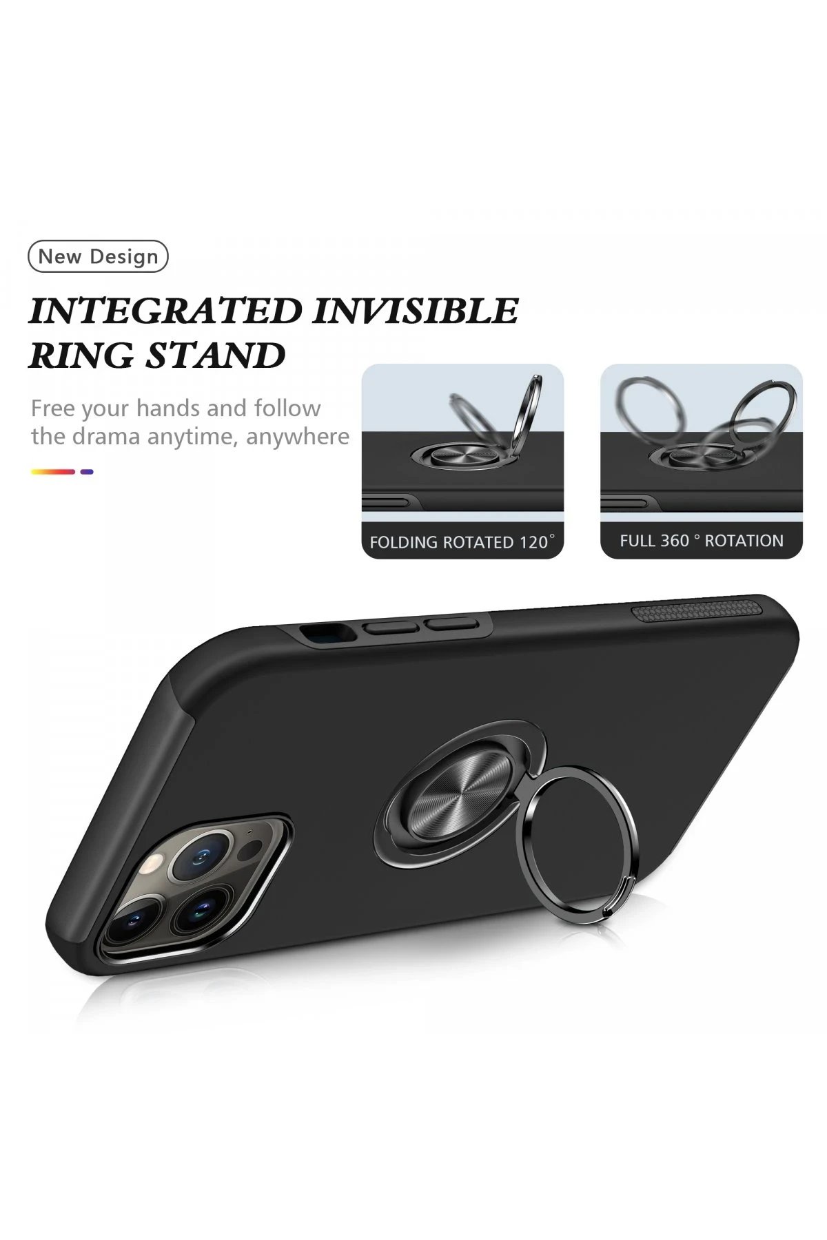 Kapak üzerinde yer alan 360° dönebilen silindir metal yüzük, hem stand işlevi görür hem de mıknatıs özelliği sayesinde araç içi manyetik telefon tutucularla tam uyum sağlar.