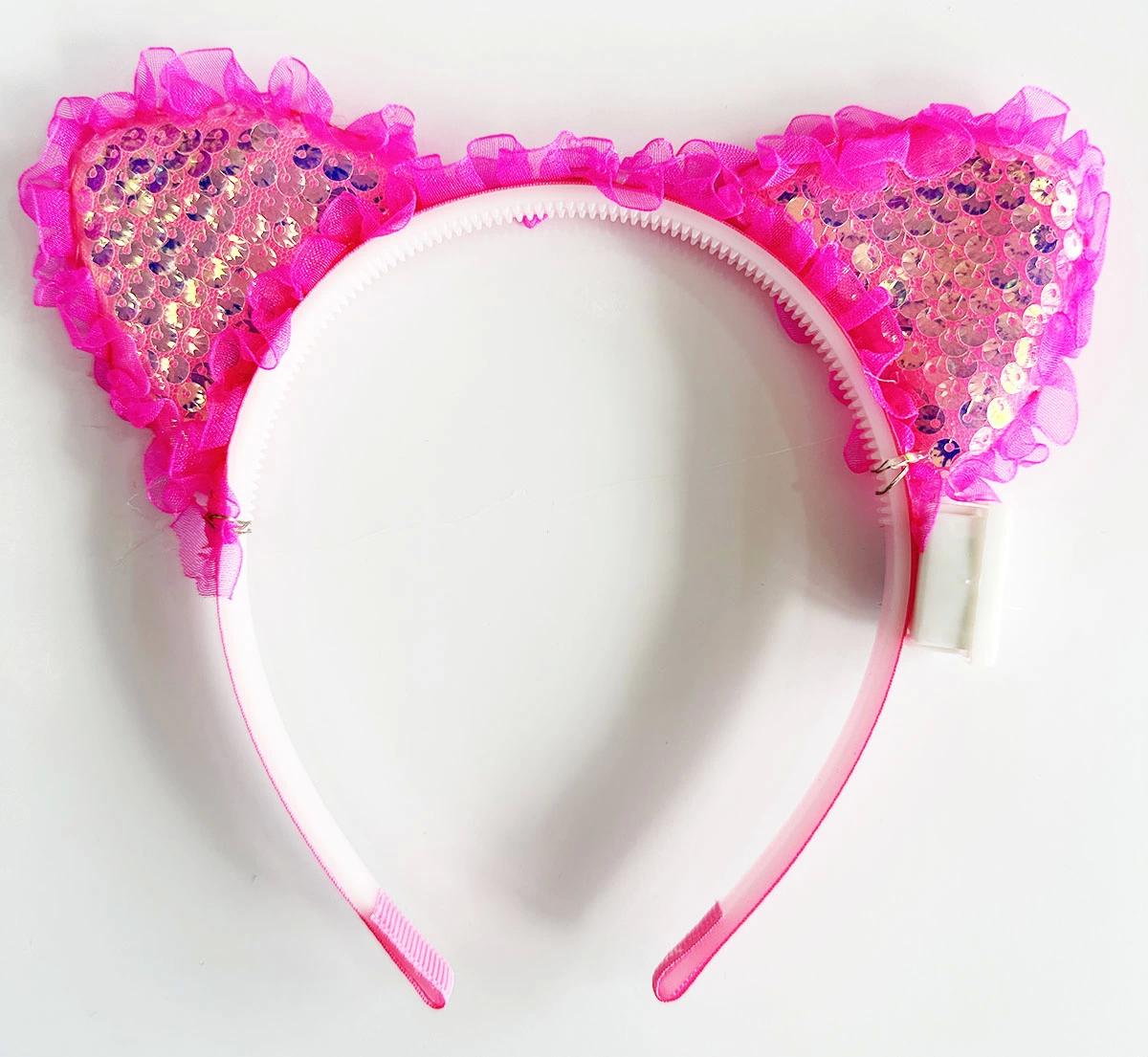 Eğlencenin ve şıklığın bir araya geldiği Kenarları Dantelli Fuşya Pullu Payetli Led Işıklı Kedi Kulak Taç ile partilerin yıldızı olun