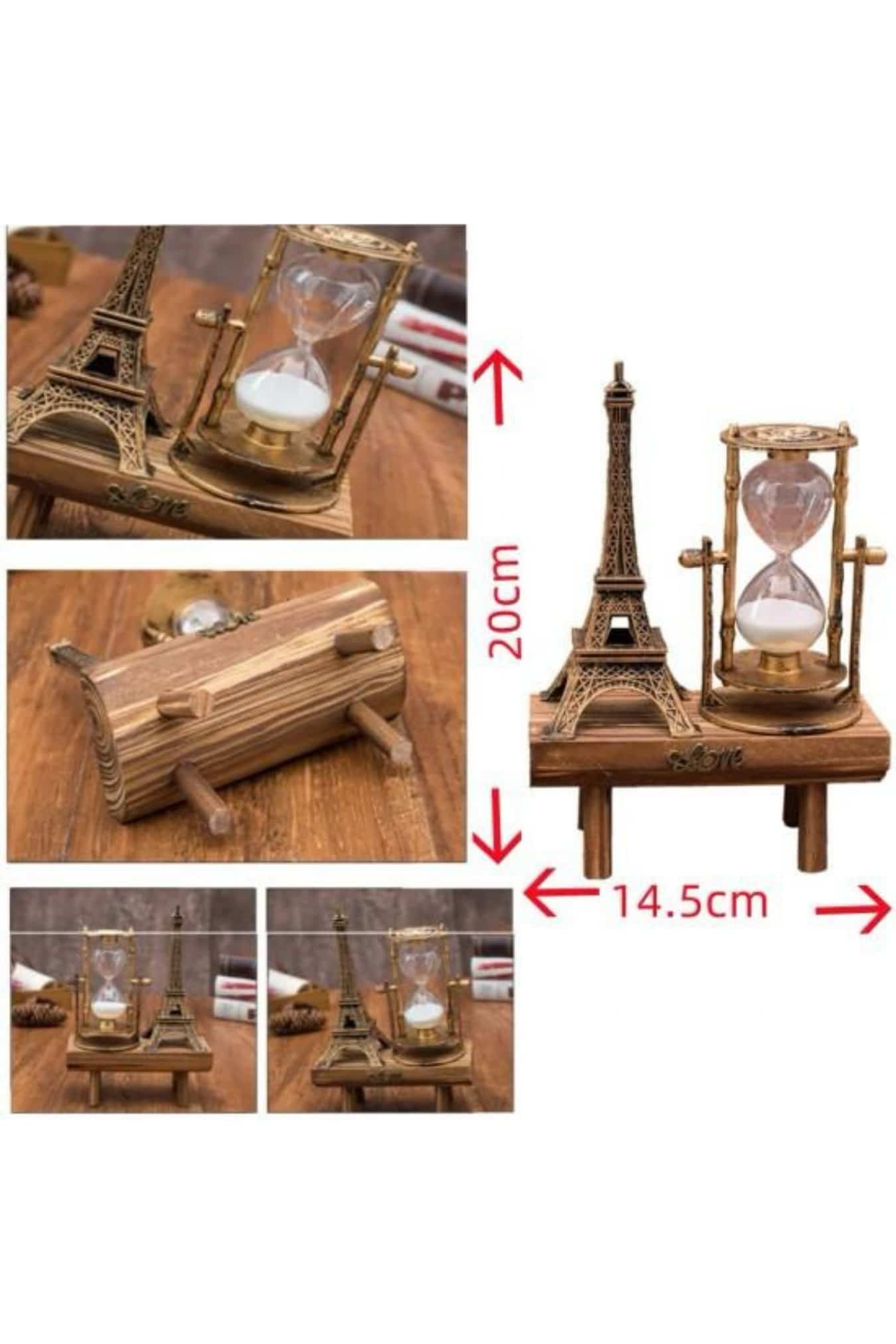 Demir Kule Temalı Dekoratif TasarımBu özel tasarım kum saati, dünyaca ünlü Demir Kule siluetiyle süslenmiştir ve her detayında zarif işçilik hissedilir. Klasik ve vintage tarzı benimseyenler için mükemmel bir dekoratif obje olmasının yanı sıra, nostaljik bir hava katmak isteyenler için de harika bir seçimdir. Şık metal çerçevesi ve dayanıklı cam bölmesi sayesinde, hem ev hem de ofis ortamlarında kullanım için uygundur. Çalışma masaları, kitaplıklar, sehpa üstleri veya vitrinlerde sergilendiğinde ortama sofistike bir hava katar.