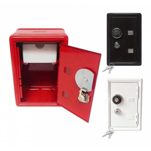 Mini Kasa Kumbara’nın anahtarları paketin içindedir. Kırmızı, beyaz ve siyah renkleri mevcuttur. Metal malzemeden yapılmış olan kasanın boyutları 12x10x18’dir.