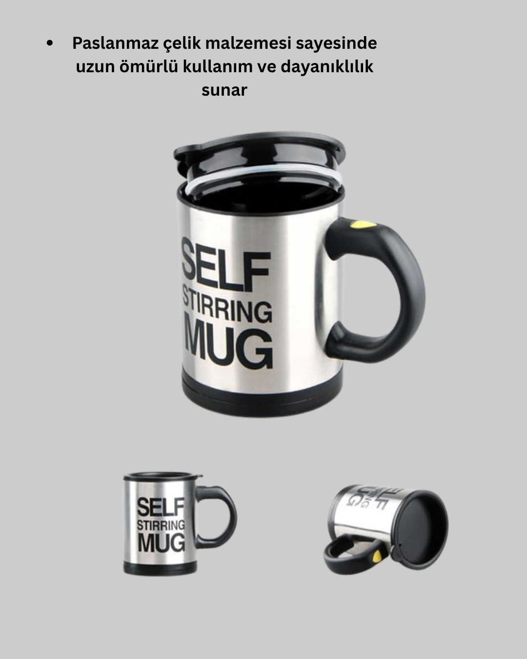 Şık tasarımı ve modern teknolojisiyle öne çıkan paslanmaz çelik kendi kendini karıştıran akıllı kupa, kahve ve içecek keyfini yepyeni bir seviyeye taşıyor. Dayanıklı paslanmaz çelik gövdesi, uzun ömürlü kullanım sunarken aynı zamanda içeceğinizin sıcaklığını koruyarak her yudumda ideal lezzeti yakalamanızı sağlar.Tek tuşla çalışan otomatik karıştırma mekanizması, çay, kahve, süt tozu, protein shake veya enerji içeceklerinizi saniyeler içinde mükemmel kıvama getirir. Karıştırıcı kaşık veya mikser kullanmanıza gerek kalmadan pratik ve hijyenik bir deneyim sunar.Isı yalıtım özelliği sayesinde sıcak içeceklerinizi uzun süre sıcak, soğuk içeceklerinizi ise ferah şekilde korur.  ofiste, evde veya seyahatlerde tarzınızı yansıtır.Kaymaz tabanlı yapısı, masa üzerinde güvenli duruş sağlar; ergonomik kulp tasarımı ise kullanım kolaylığı sunar.Günün her saatinde sıcak kahve, pürüzsüz sütlü kahve ya da lezzetli shake’ler hazırlamak artık çok kolay.Kendi kendini karıştıran paslanmaz çelik kupa, hem estetik hem de fonksiyonelliği bir araya getirerek teknolojiyle konforu buluşturur.