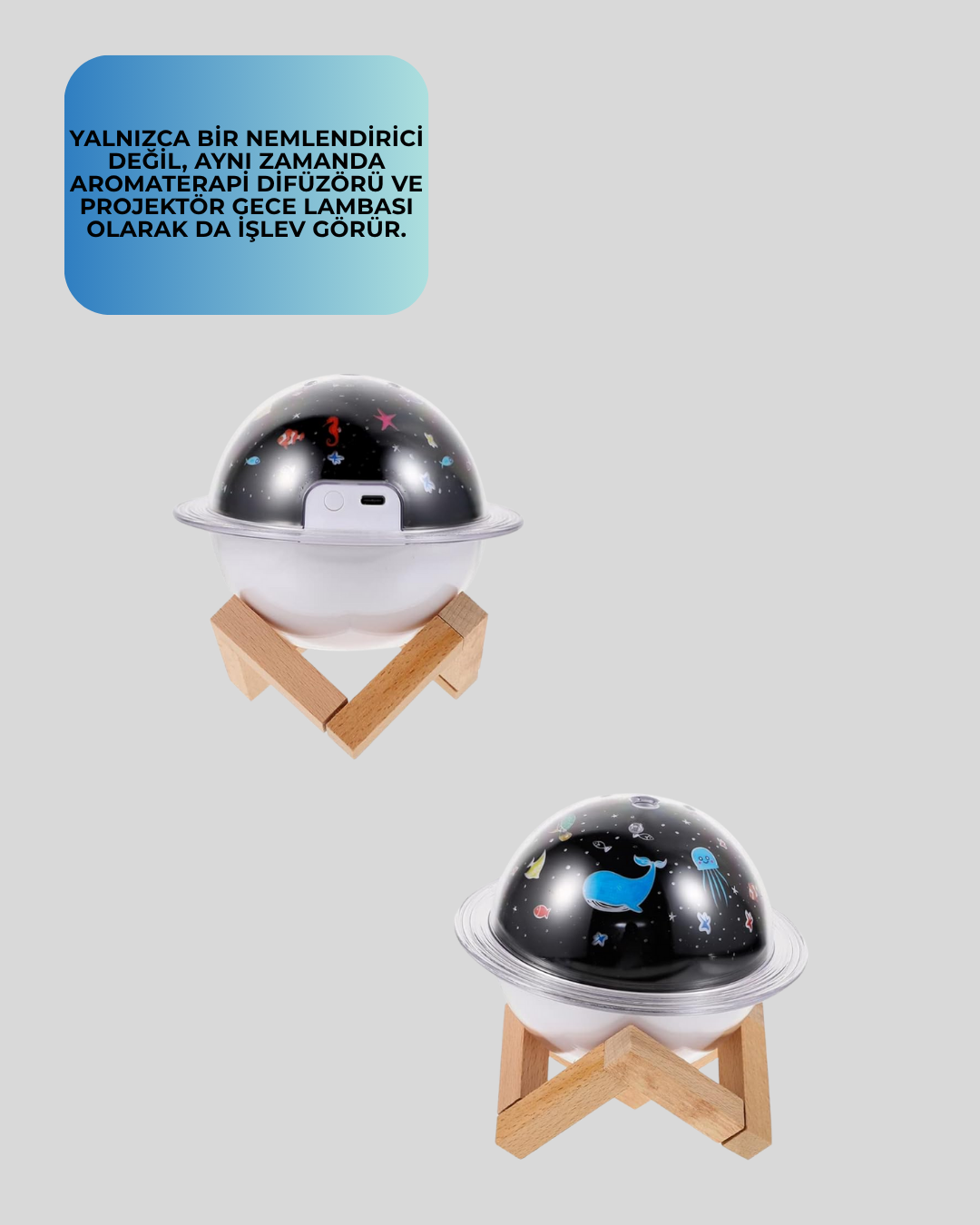 Bu kompakt boyutlu masaüstü nemlendirici, 3 işlevi bir arada sunar: hava nemlendirme, aroma difüzör ve projektör ışıklı gece lambası. 5V düşük voltajla çalışır ve USB kablosu ile kolayca bağlanır. Sessiz çalışma özelliğiyle geceleri rahatsız etmeden çalışabilir.Projektör ışığı, deniz dalgası efektiyle ortama huzur verir. Özellikle çocukların uykuya dalarken rahatlamasını sağlar. Cihazın üst kısmındaki hazneye esansiyel yağ eklenebilir ve bu şekilde aromaterapi deneyimi yaşanabilir. Hem işlevsel hem dekoratif bir üründür. Ofisler, yatak odaları ve küçük alanlar için uygundur.