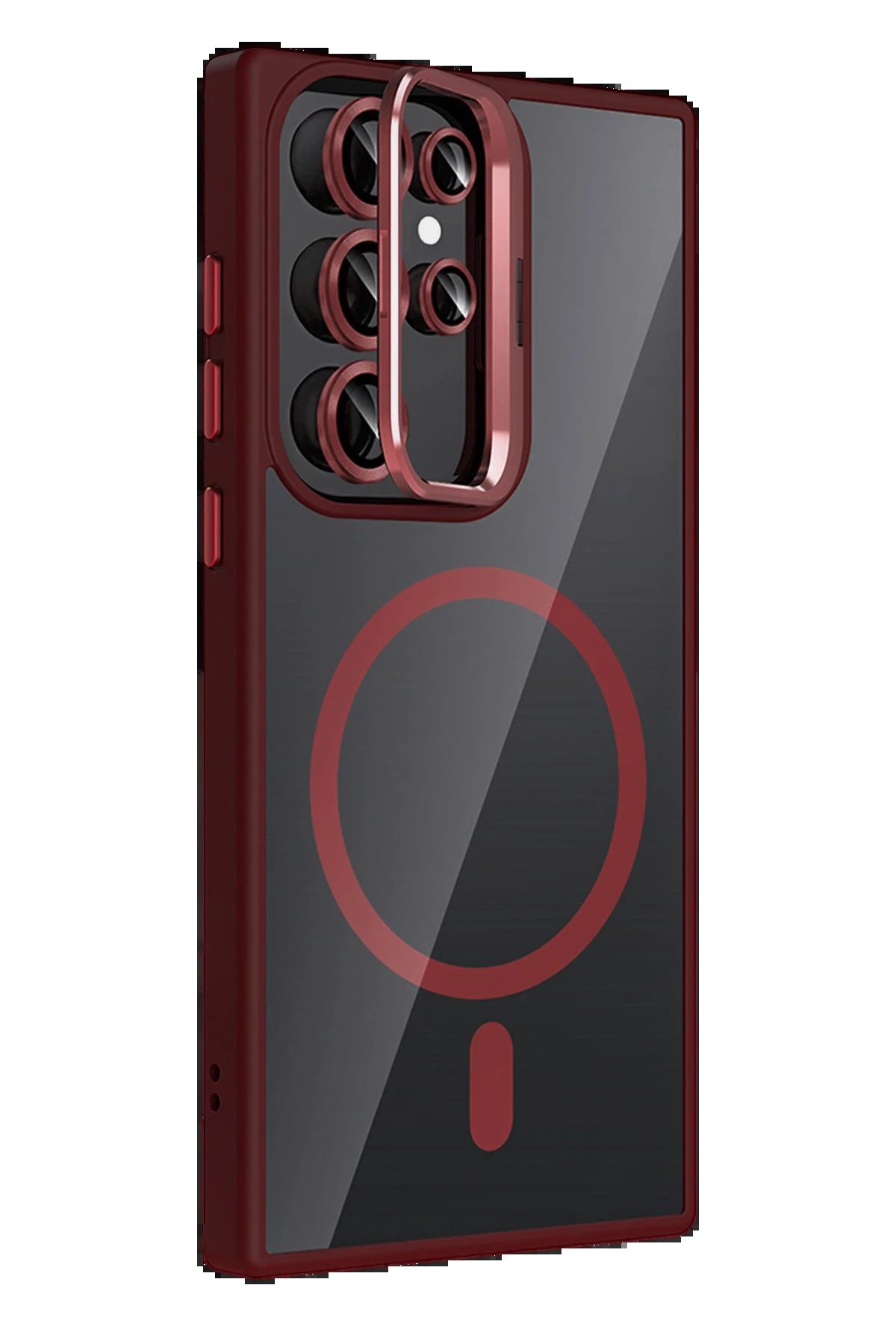 Samsung Galaxy S23 Ultra Remim Lensli Magsafe Standlı Kapak - Bordo-(5796)
