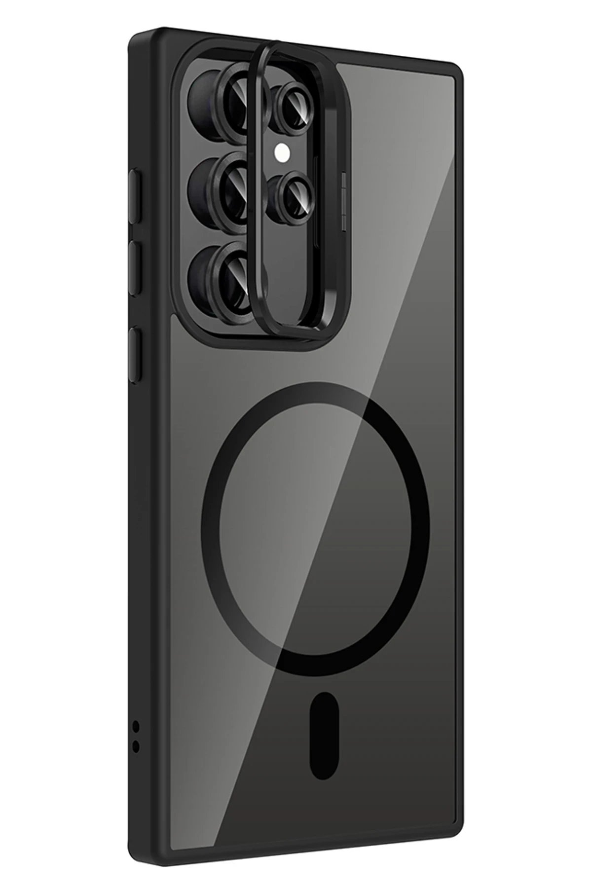 Samsung Galaxy S24 Ultra Remim Lensli Magsafe Standlı Kapak - Siyah-(5796)