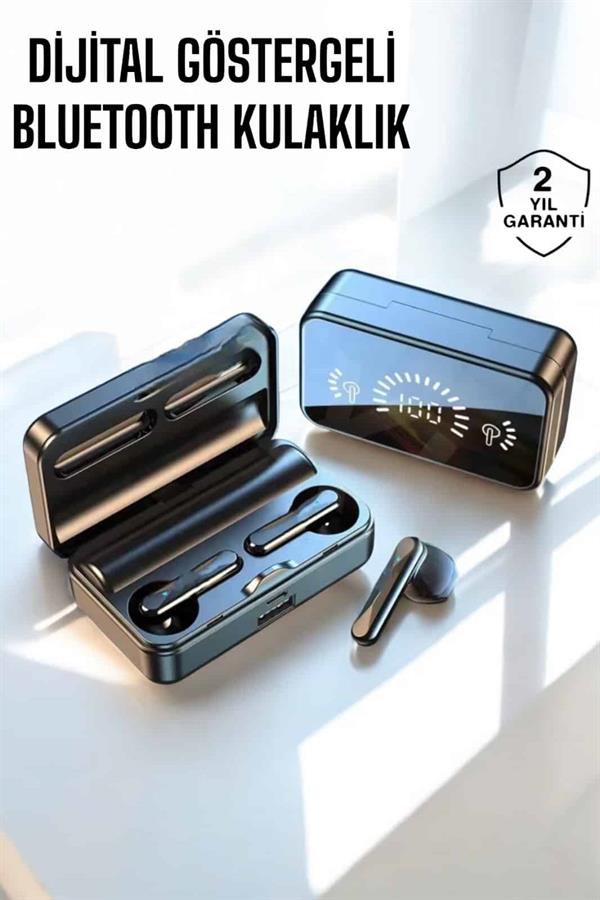Yüksek Performanslı Bluetooth Kulaklık - Kesintisiz Müzik ve Konuşma DeneyimiBluetooth 5.0 teknolojisiyle donatılmış bu kulaklıklar, müzik dinlerken veya telefon görüşmelerinde size kesintisiz bir deneyim sunar. Çift dijital gösterge sayesinde kulaklıklarınızın pil seviyesini kolayca takip edebilirsiniz. 5-6 gün boyunca şarj edilmeden kullanım sağlayan uzun pil ömrü, sizi sürekli şarj etme zahmetinden kurtarır. Ayrıca, şarj kutusu 2000mAh kapasitesiyle kulaklıklarınızı birden fazla kez hızlıca şarj eder.Gelişmiş Ses ve Gürültü Önleme Teknolojisi ile Net İletişimKulaklıklar, güçlü bass özelliğiyle zengin bir ses deneyimi sunarken, aktif gürültü önleyici teknoloji sayesinde dış dünyadan gelen gürültüyü etkili bir şekilde engeller. Bu özellik, telefon görüşmelerinizde karşı tarafa daha net bir ses iletmenizi sağlar, özellikle gürültülü ortamlarda ses kalitesinden ödün vermez. Sesli komut özellikleriyle müzik çalma/durma ve çağrı cevaplama gibi işlemleri kolayca kontrol edebilirsiniz.Suya Dayanıklı ve Ergonomik Tasarım ile Konforlu KullanımIPX5 suya dayanıklılık özelliği ile terlemeye ve yağmura karşı korumalıdır, bu sayede spor yaparken veya dış mekanlarda kullanım için idealdir. Hafif ve ergonomik yapısı, uzun süreli kullanımlarda bile rahatlık sunar. Şık siyah tasarımı, her ortamda şıklığınızı yansıtır. Bu kulaklıklar, müzik dinlerken veya konuşurken konforlu bir deneyim sağlamak için mükemmel bir seçimdir.