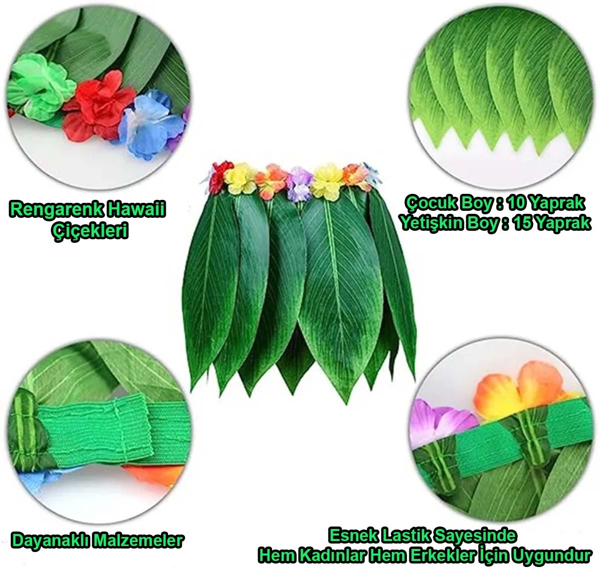 Doğal görünümlü yapay yapraklardan özenle hazırlanan bu etek, tropikal temalı etkinlikleriniz, partileriniz veya özel günleriniz için mükemmel bir seçim. İster Hawai temalı bir doğum günü kutlaması, ister yaz partisi, ister kostüm balosu olsun, bu etek ile tüm dikkatleri üzerinize çekeceksiniz.