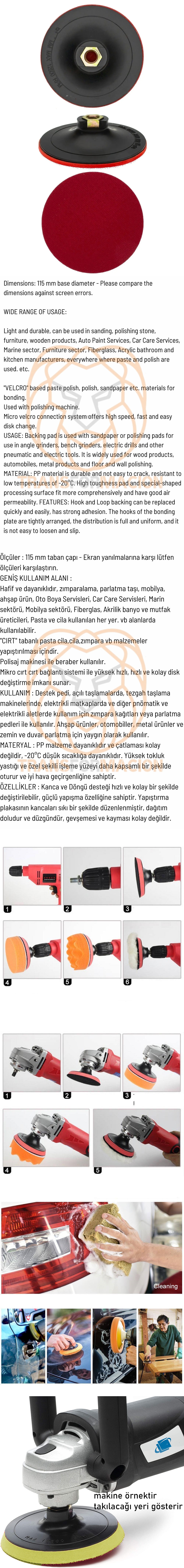 KULLANIM : Destek pedi, açılı taşlamalarda, tezgah taşlama makinelerinde, elektrikli matkaplarda ve diğer pnömatik ve elektrikli aletlerde kullanım için zımpara kağıtları veya parlatma pedleri ile kullanılır. Ahşap ürünler, otomobiller, metal ürünler ve zemin ve duvar parlatma için yaygın olarak kullanılır.