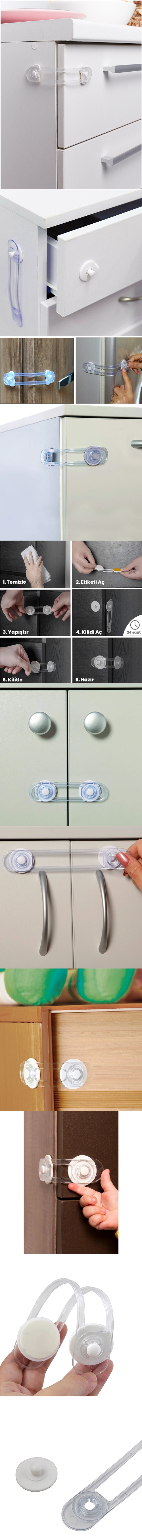 Dolap, Çekmece, Buzdolabı gibi yerlerin açılmasını engeller. Çok kuvvetli kendinden yapışkanıyla kolaylıkla yapıştırılabilir
