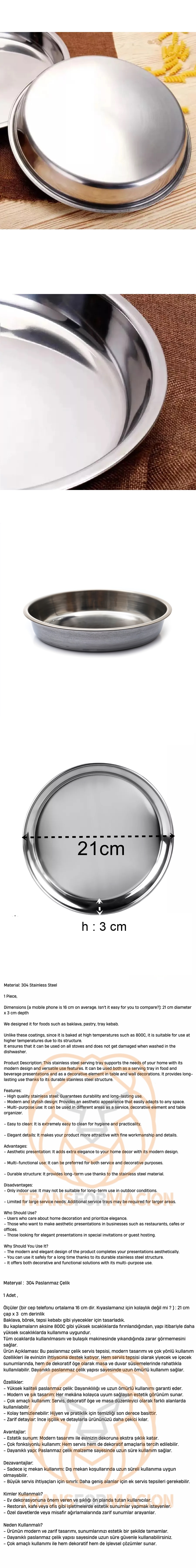 Ürün Açıklaması: Bu paslanmaz çelik servis tepsisi, modern tasarımı ve çok yönlü kullanım özellikleri ile evinizin ihtiyacına destek katıyor. Hem servis tepsisi olarak yiyecek ve içecek sunumlarında, hem de dekoratif öge olarak masa ve duvar süslemelerinde rahatlıkla kullanılabilir. Dayanıklı paslanmaz çelik yapısı sayesinde uzun ömürlü kullanım sağlar.