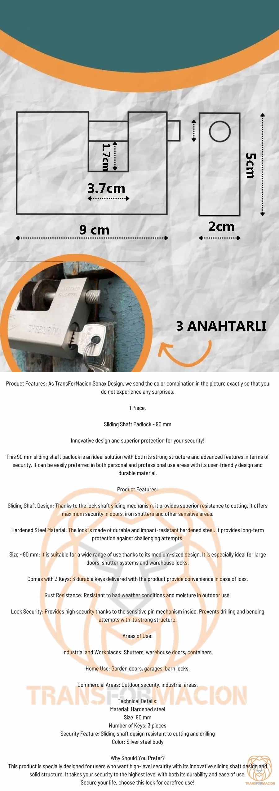 Bu 90  mm kayar milli asma kilit, hem güçlü yapısıyla hem de güvenlik açısından sunduğu gelişmiş özelliklerle ideal bir çözümdür. Kullanıcı dostu tasarımı ve dayanıklı malzemesiyle hem kişisel hem de profesyonel kullanım alanlarında rahatlıkla tercih edilebilir.