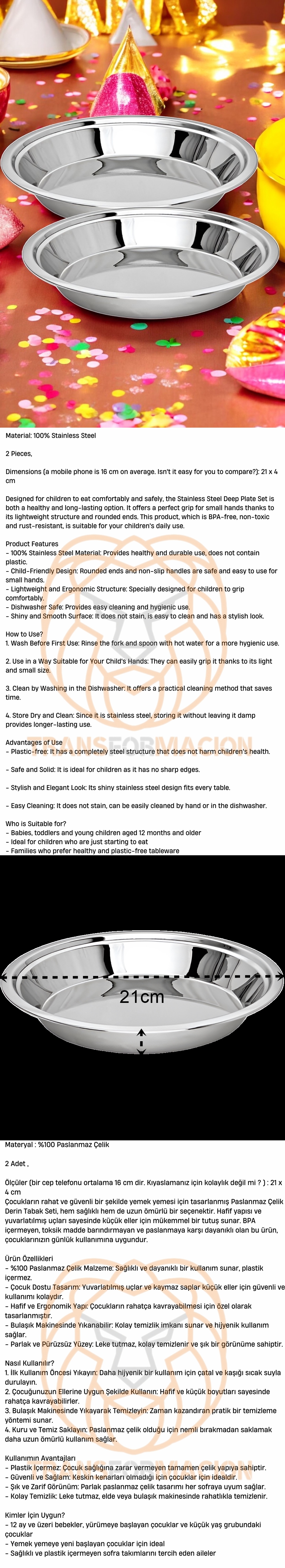 Turk Çocuk Tabağı Güvenli Kenarlı Çelik 2 Adet 21 cm