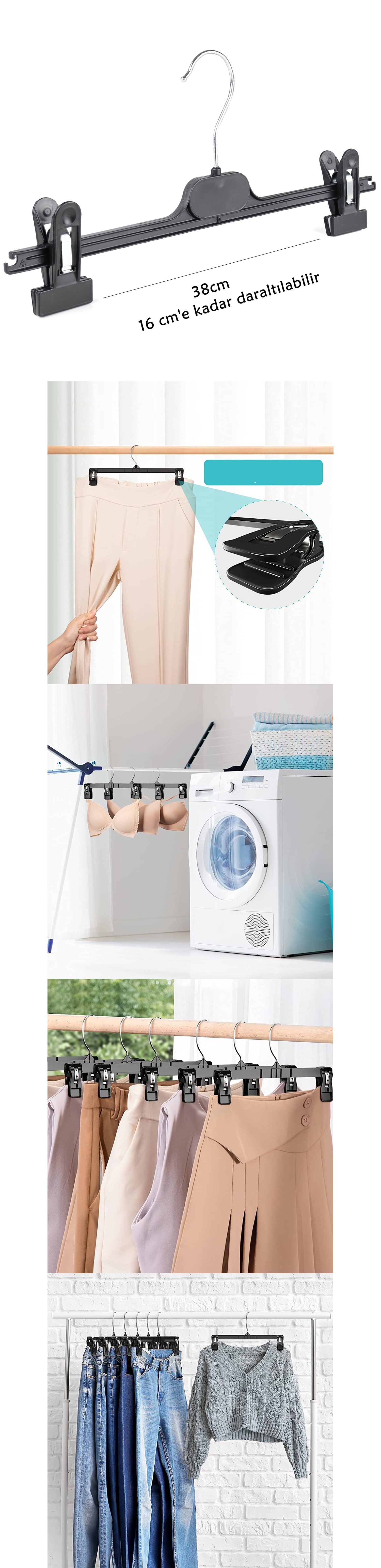ERGONOMİK : Elbise askılarındaki 18 adet ayarlanabilir klips, etekleri ve pantolonları kolaylıkla tutar ve pantolon askılarındaki kesik çentikler, ince omuz askılarını güvenli bir şekilde yerinde tutar. Klipsli askıları sayesinde pantolon veya etek gömleklere kolayca asılabilir.