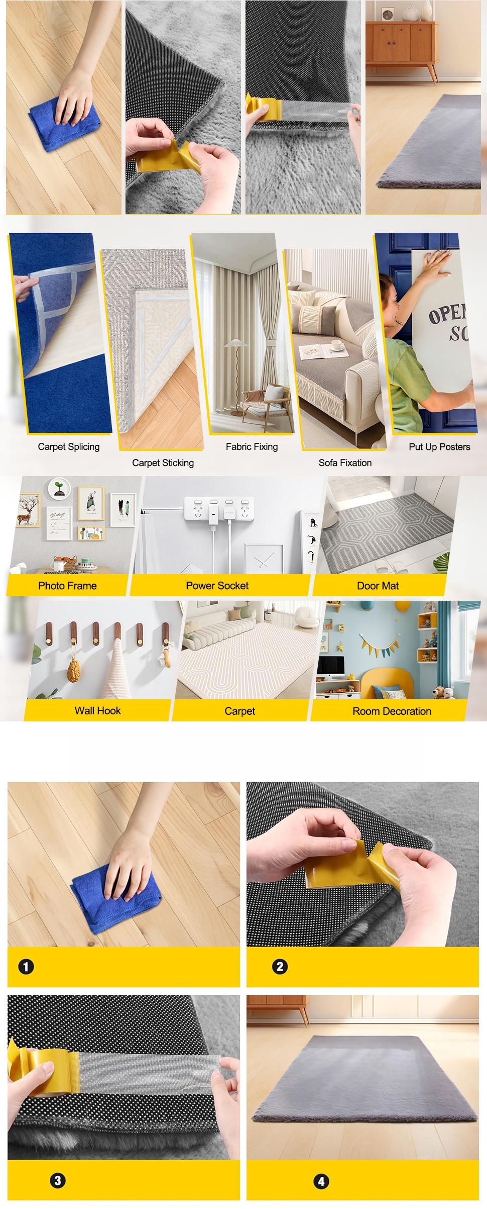 SON DERECE UYUMLU - Bu güçlü çift taraflı bant, sıradan bantla karşılaştırıldığında ekstra bir bez bazlı alt tabaka katmanına sahiptir. Bu yumuşak malzeme, yapıştırıldığında halının kolayca yerinden oynamamasını sağlar. İster düğün ister otel olsun, kenarın kıvrılmasını veya kırışmasını önlemek için halıyı sıkıca yapıştırabilir. Bunu seçerek, halının sağlamlığını sağlamak için halıyı güvenle yapıştırabilir ve birleştirebilir, mekanınıza temizlik ve güzellik katabilirsiniz.