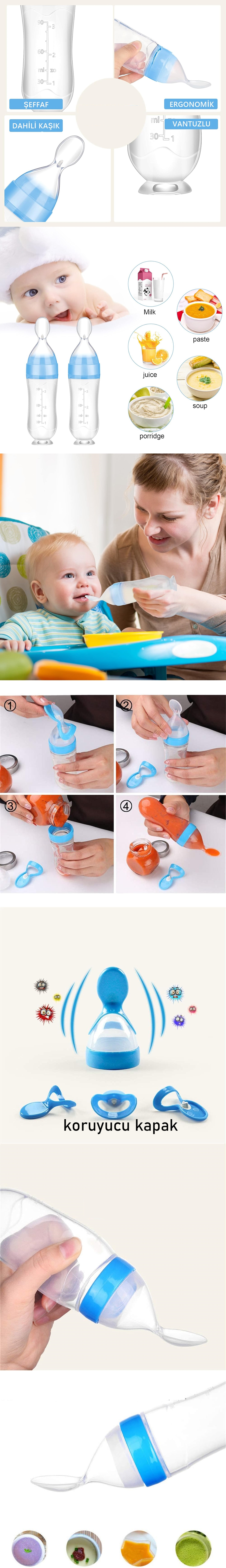 SIKMA KONTROLÜ BESLEME BEBEĞİ KORKMAZ : Sıkma tasarımı çocuğun kendi kendine beslenmesini etkili bir şekilde uygulayabilir ve alımı kontrol etmek kolaydır. Kaşık besleyici, el-göz koordinasyonunu ve ince motor becerilerini geliştirir.