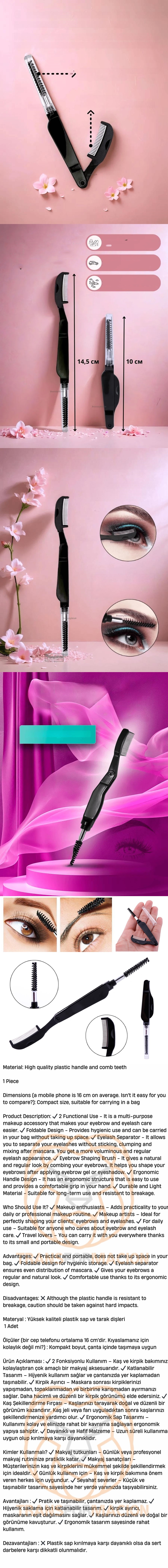 Avantajları : ✔ Pratik ve taşınabilir, çantanızda yer kaplamaz. ✔ Hijyenik saklama için katlanabilir tasarım. ✔  kirpik ayırıcı, maskaranın eşit dağılmasını sağlar. ✔ Kaşlarınızı düzenli ve doğal bir görünüme kavuşturur. ✔ Ergonomik tasarım sayesinde rahat kullanım.