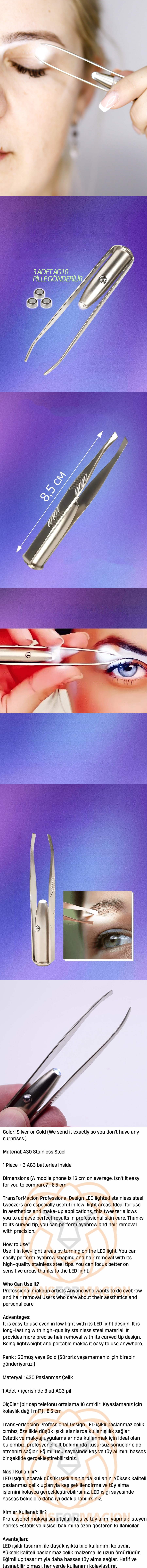 LED ışıklı tasarımı ile düşük ışıkta bile kullanımı kolaydır. Yüksek kaliteli paslanmaz çelik malzeme ile uzun ömürlüdür. Eğimli uç tasarımıyla daha hassas tüy alma sağlar. Hafif ve taşınabilir olması, her yerde kullanımı kolaylaştırır.