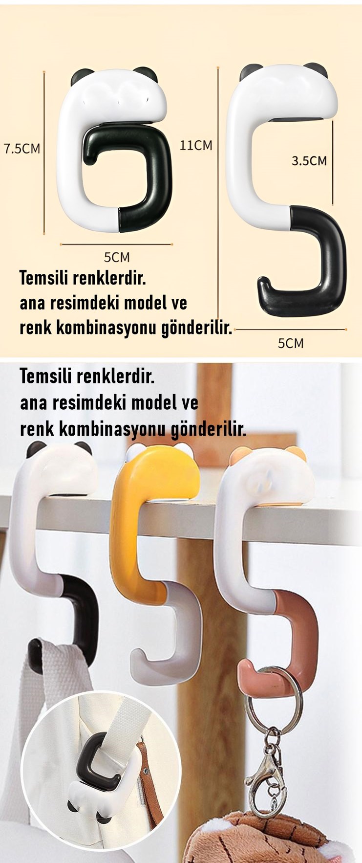 Turk Masa Kenarı Çanta Kancası Çanta Tutucu Askı Masa Askısı – 2 Adet Pratik Çözüm Turk Masa Kenarı Çanta Kancası, çantalarınızı güvenli ve düzenli bir şekilde asmanız için tasarlanmış şık ve pratik bir aksesuardır. 2 adet olarak sunulan bu set, sevimli   figürlü tasarımı ve farklı renk seçenekleriyle hem işlevsel hem de dekoratiftir. 7,5 cm yüksekliği, 5 cm genişliği ve 3,5 cm derinliği ile kompakt bir yapıya sahiptir. Maksimum 5 kg taşıma kapasitesi sayesinde çantalarınızı güvenle asabilirsiniz. Katlanabilir tasarımı, kullanılmadığında kolayca saklanmasını sağlar. Restoran, kafe, ofis veya evde kullanım için ideal bir çözümdür.