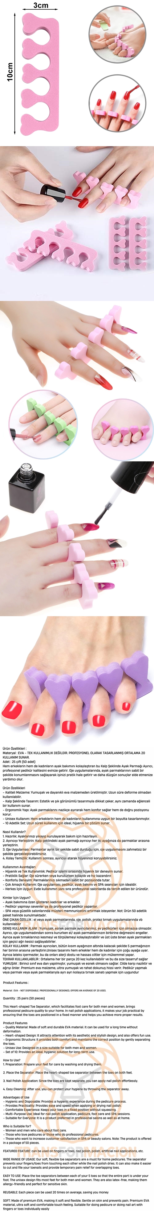 GENİŞ KULLANIM ALANI : Yumuşak, esnek parmak ayırıcılarımız, ev pedikürleri için olmazsa olmazdır. Ayırıcı, oje uygulamadından sonra kururken el/ ayak parmaklarınızın birbirine değmesini engeller. Ayrıca ayak tırnaklarınızı kesmeyi ve törpülemeyi kolaylaştırabilir ve üst üste binen ayak parmakları için geçici ağrı kesici sağlayabilirler.