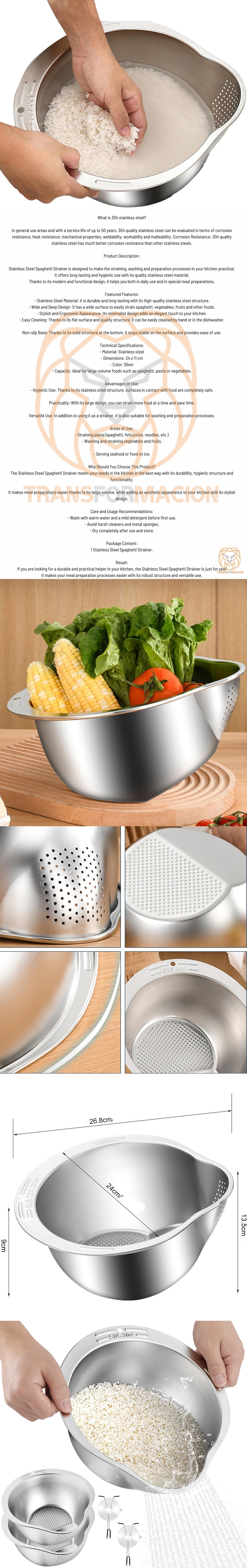 Paslanmaz Çelik Spagetti Süzgeci, mutfağınızdaki süzme, yıkama ve hazırlık işlemlerini pratik hale getirmek için tasarlanmıştır.