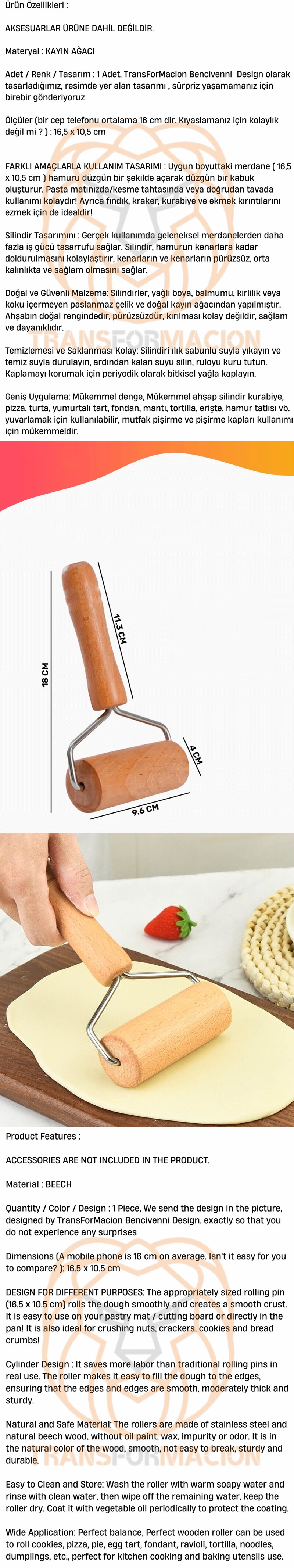 FARKLI AMAÇLARLA KULLANIM TASARIMI : Uygun boyuttaki merdane ( 16,5 x 10,5 cm ) hamuru düzgün bir şekilde açarak düzgün bir kabuk oluşturur. Pasta matınızda/kesme tahtasında veya doğrudan tavada kullanımı kolaydır! Ayrıca fındık, kraker, kurabiye ve ekmek kırıntılarını ezmek için de idealdir!