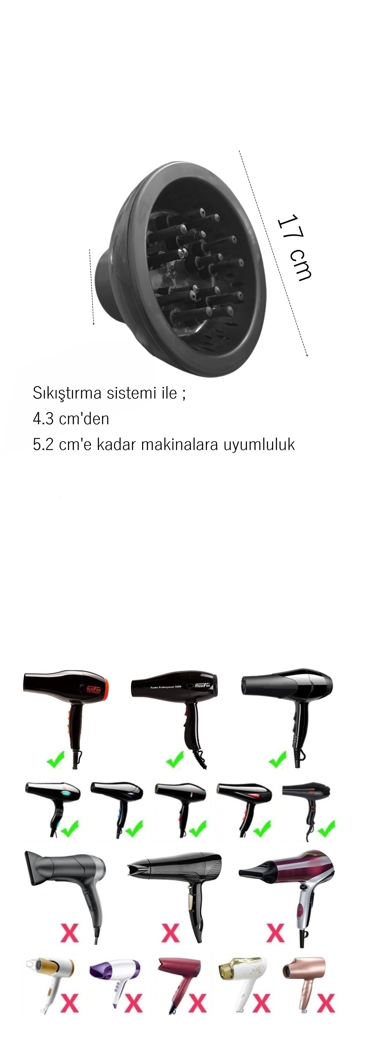 Ölçüler : 17 cm üfleme çapı - 15 ana nokta çıkışı  - Sıkıştırma sistemi ile ; 4.3'den 5.2 cm çapa kadar çıkışı olan kurutma makinelerine uyumludur