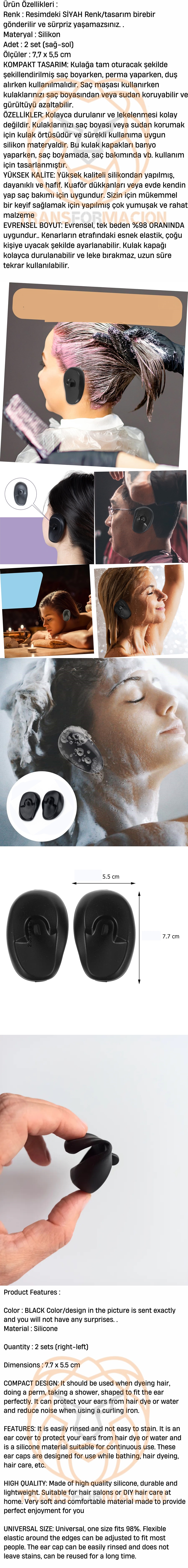 ÖZELLİKLER: Kolayca durulanır ve lekelenmesi kolay değildir. Kulaklarınızı saç boyası veya sudan korumak için kulak örtüsüdür ve sürekli kullanıma uygun silikon materyaldir. Bu kulak kapakları banyo yaparken, saç boyamada, saç bakımında vb. kullanım için tasarlanmıştır.