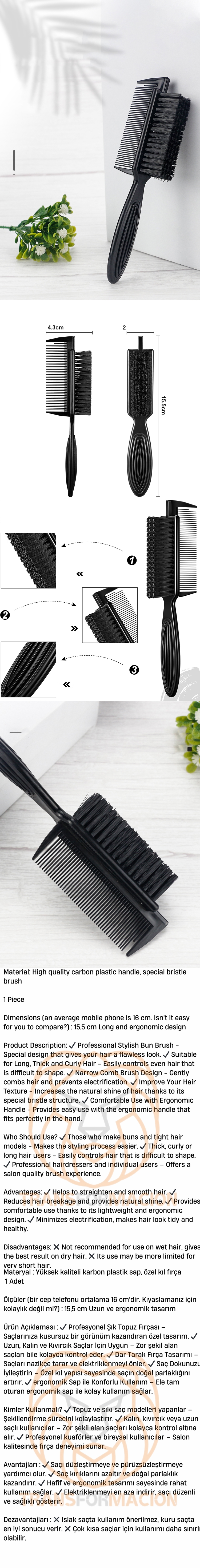Ürün Açıklaması : ✔ Profesyonel Şık Topuz Fırçası – Saçlarınıza kusursuz bir görünüm kazandıran özel tasarım. ✔ Uzun, Kalın ve Kıvırcık Saçlar İçin Uygun – Zor şekil alan saçları bile kolayca kontrol eder. ✔ Dar Tarak Fırça Tasarımı – Saçları nazikçe tarar ve elektriklenmeyi önler. ✔ Saç Dokunuzu İyileştirin – Özel kıl yapısı sayesinde saçın doğal parlaklığını artırır. ✔ ergonomik Sap ile Konforlu Kullanım – Ele tam oturan ergonomik sap ile kolay kullanım sağlar.